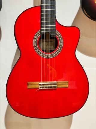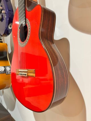 Guitarra flamenca modelo Candela en color rojo amplificada con previo OS1. - Acabado brillante en color rojo. - Modelo Candela en palosanto con tapa maciza de pino abeto. Diapasón de ébano. Golpeador transparente Enviamos a toda España a través de transporte urgente o a través de Wallapop