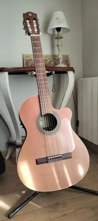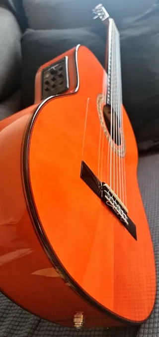 Guitarra clásica con opción de amplificación. Ideal para quienes buscan versatilidad en su sonido. Como nueva. Sin golpes ni roces. Regalo funda. - Cuerpo de madera con cutaway. - Mástil de madera. - Diapasón con trastes. Sólo trato en mano.