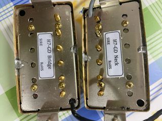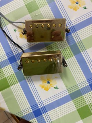 Pastillas para guitarra eléctrica Larry Carlton H7, acabado dorado. - nuevas, aun con los plasticos protectores. probadas y quitadas para cambio por otras pastillas. - con toda su longitud de cable - Set de dos pastillas. - Diseño clásico para guitarras tipo hollowbody. nuevas - Si no haces division de bobinas negro y desnudo a masa, verde y blanco juntos y rojo el hot incluye muelles y tornillos