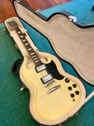 Guitarra eléctrica Gibson SG Reissue 61. Un clásico con un sonido potente y versátil. - Acabado en color blanco vintage. - Pastillas humbucker dobles. - Mástil de caoba. - Diapasón de palisandro. - 2007