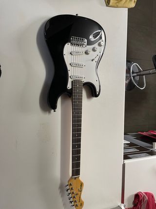 Guitarra eléctrica de color negro con acabado brillante. Ideal para principiantes o aficionados. - Cuerpo de madera. - Mástil de arce. - Diapasón de palisandro. - Tres pastillas single-coil. - Puente trémolo. Funcionan perfectamente