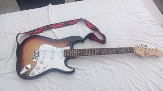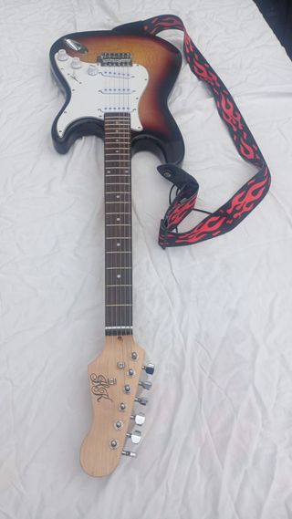 Guitarra eléctrica SX tipo stratocadter en estupendo estado. Ideal para principiantes o para músicos experimentados que buscan una guitarra versátil. - Cuerpo de aliso con acabado sunburst. - Mástil de arce. - Pastillas single coil. - Puente trémolo. - Incluye funda. No leer: Fender stratocaster, Gibson, Ibanez, PRS, Suhr, Harley Benton, Yamaha.