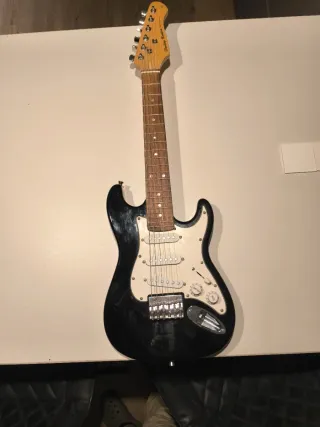 Guitarra eléctrica en buen estado, lista para tocar. Tal y como se ve en las fotos. - Color negro brillante. - Diseño clásico de Stratocaster. - Puente cromado. - Tres pastillas single-coil. - Controles de volumen y tono.