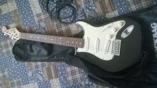 Guitarra eléctrica Stagg en color negro, en excelente estado. - Modelo Stagg. - Color negro. - Incluye pegatina de Guns N' Roses. (Se puede quitar) - 1 Púa - Cable de sonido para amplificador - Palanca de tremolo - Funda original de la guitarra