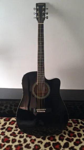 Guitarra electroacústica Axman negra con bordes blancos, diseño elegante y acabado brillante. La compré hace unos meses con intención de aprender, pero solo la usé un par de veces, así que está en muy buen estado. Siempre ha estado guardada en interior y funciona perfectamente. Incluye funda de tela original, manual de instrucciones, púas y accesorio adicional. Ideal para principiantes o para quien busque una guitarra económica y bien cuidada.