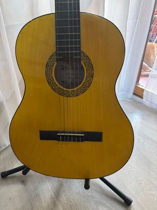Guitarra clásica española en buen estado. Incluye soporte. Tiene un color amarillo. -Cuerpo de madera. -Diapasón -Incluye soporte. adinador electronico libro de iniciacion