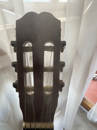Guitarra española clásica de madera. - Cuerpo de madera con acabado natural. - Diapasón de madera con trastes. - Cuerdas de nylon. - Clavijero metálico.