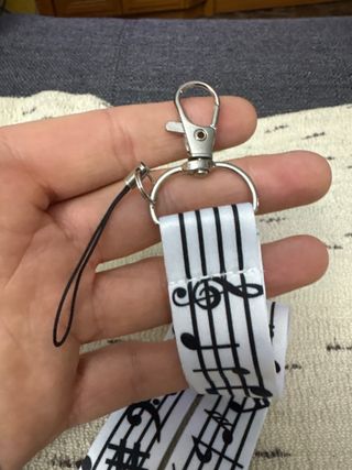 Lanyard con diseño musical en blanco y negro. Ideal para colgar llaves o un móvil. - Diseño elegante y discreto. - Material resistente y duradero. - Incluye mosquetón y cordón. 2 ud: 5€ Stock 2 Llavero con forma de trompeta, corneta, batería, percusión, tambor, baquetas, guitarra española, notas musicales, violín, viola, violonchelo (cello), contrabajo, piano, clarinete, guitarra eléctrica, bajo eléctrico, clave de sol, flauta, saxofón, tuba, bombardino, trompa batuta Djembe Pin clave de sol partitura piano notas musicales bateria tambor gemelos clave de sol música Anillos pulsera colgantes collares calcetines gemelos musica