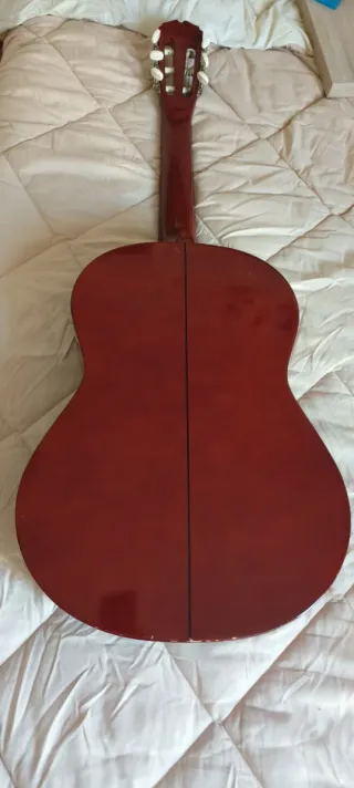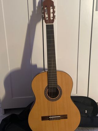 Guitarra española clásica de tamaño completo, ideal para iniciarse o para músicos intermedios. Se encuentra en buen estado y lista para tocar. - Cuerpo de madera clara. - Diapasón de madera oscura. - Cuerdas de nylon. - Incluye funda protectora negra.