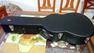 Estuche rígido diseñado para guitarras españolas. Protege tu instrumento con estilo. - Exterior en acabado texturizado negro. - Cierres metálicos de seguridad. - Asa de transporte reforzada. - Logo de la marca visible en la tapa.