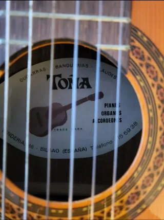 Guitarra española de la marca Toña. - Cuerpo de madera clara. - Diapasón oscuro. - Cuerdas de nylon. Se incluye funda.