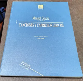 Canciones y Caprichos Líricos de Manuel García (1775-1832), colección Música Hispana del ICCMU. 1a página del índice en las fotos - Edición crítica a cargo de Celsa Alonso. - Incluye Antologías Canción Española. - Agotado, descatalogado Año 2003 Canciones y caprichos líricos Plantilla Voz, piano / guitarra Colección Música Hispana. Partituras Edición 1.ª edición ISMN 848048103X Páginas 173 Tamaño 22,5x29,5 cm Peso 0.568 kg Dimensiones 29,5 × 22 El arte de Manuel García (1775-1832) ha sido probablemente más apreciado en Francia que en España, donde su música ha tenido menos proyección de la que merece. Ópera. Canto. Tenor. Sopran