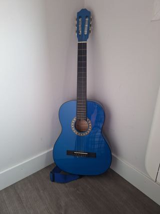 Guitarra española de color azul, ideal para iniciarse en la música. También regalo cuerdas de repuesto - Cuerpo de madera. - Mástil de madera. - Cuerdas de nylon.