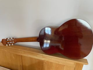 Guitarra española clásica con un acabado en madera natural. Con certificado de serie en el interior origen español. Valorada en 550€. Tiene una pequeña muesca en el culo y en el mástil. - Cuerpo de madera. - Mástil de madera. - Diapasón de madera. - Funda de transporte - Cuerdas nuevas