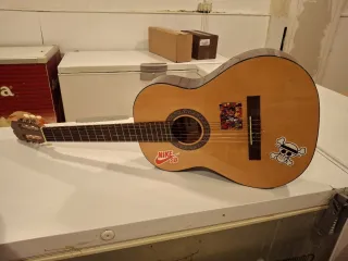 Guitarra española clásica con funda. - tiene golpe parte inferior ver foto, funciona perfectamente. - Cuerpo de madera. - Cuerdas de nylon. - Funda a cuadros incluida.
