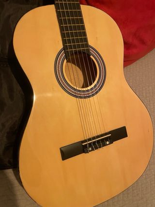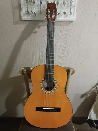Guitarra española en excelente estado, casi sin uso. - Acabado natural brillante. - Cuerdas de nylon. - Diseño clásico.