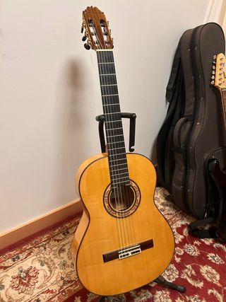 Guitarra totalmente artesana Manuel Rodríguez modelo JR la guitarra es toda maciza tapa de Cedro de Canadá aros y fondo macizo de Palosanto de Indias diapasón de ébano y refuerzo de ébano en el mastil con filetreia artesana igualmente toda la tapa lleva al rededor una filetreia de espigas una pasada de guitarra con un volumen brutal la vendo por que para mí es mucha guitarra y es una pena porque yo no le sacaría el potencial que tiene está totalmente como nueva no tiene ni el más mínimo arañazo la entrego con estuche rígido Cibeles