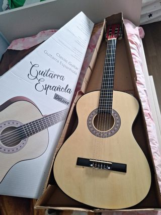 Guitarra Española Clásica Deluxe, en perfecto estado. Ideal para principiantes. - Incluye cuerdas de nylon. - Sonido nítido y brillante. - Acabado impecable.