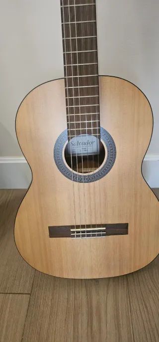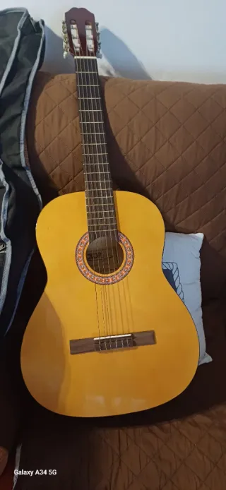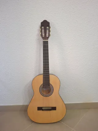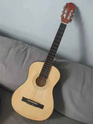 Guitarra española de tamaño reducido, ideal para iniciarse en la música. CARACTERÍSTICAS: Marca: Admira Color: Natural Tipo de material de la parte superior: Pino,Caoba Material del cuerpo: Pino Tipo de material de refuerzo: Madera de sapele Tipo de material del cuello: Caoba Especial para cadetes Tapa de pino oregón Brazo de caoba africana Trastes de alpaca La usamos un curso para extraescolares de niño de 7 años pero no sigue con guitarra este curso próximo. Tiene algunos golpes como se vé en las fotos, pero suena perfectamente. Regalo funda negra. Sólo recoger. Zona Plaza España en Sevilla En Amazon vale 157€.
