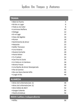 CUADERNO DE ACORDES DE GUITARRA de los temas más destacados de estos 3 grupos del Rock Andaluz **Creación Propia**. 28 TEMAS PRINCIPALES DE LA DISCOGRAFÍA DE TRIANA, ALAMEDA e IMAN Califato Independiente. CLASIFICADO POR ALBUMNES MÉTODO FACIL PARA EL SEGUIMIENTO DE CADA TEMA (ver fotos): Acordes en español. Nombre de la Nota y Acordes sobrepuestos en las letras de los temas, para una rápida identificación. Cada tema ocupa 2 hojas, par e impar, para facilitar su lectura. Formato: Se presenta en fotocopias de alta calidad en cuaderno de gusanillo y cubierta de acetato. 60 paginas **BLANCO/NEGRO** Tamaño: 30 x 21.5 cm