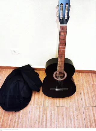 Guitarra española de color negro, ideal para principiantes o músicos intermedios. Se encuentra en buen estado. - Cuerpo de madera. - Mástil de madera. - Cuerdas de nylon.