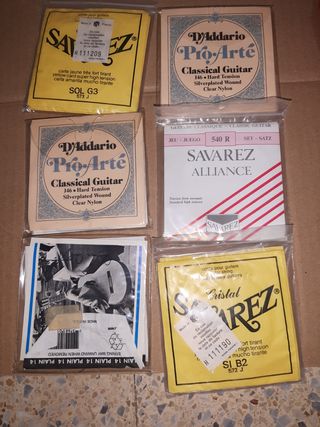 6 paquetes de cuerdas para guitarra española ,sin devolución. 4 paquetes completos 1 con 5 cuerdas y 1 con 2 cuerdas.