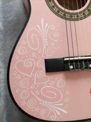 Guitarra clásica española de color rosa, ideal para iniciarse en la música. Presenta un diseño decorado con corazones y estrellas blancas. - Color: Rosa - Diseño: Corazones y estrellas blancas - Tipo: Clásica española