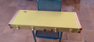 Maleta rígida para guitarra eléctrica, estilo Fender, con acabado tweed. - Revestimiento exterior en tweed amarillo. - Ribetes y esquinas en polipiel marrón. - Cierres metálicos dorados. - Asa de transporte en polipiel marrón.