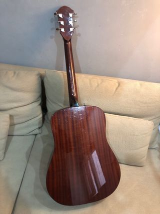 Es electroacústica, es decir, se puede conectar a un amplificador de guitarra. Tiene bastantes golpes, pero suena bastante bien y está bien conservada.