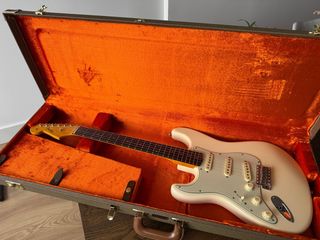 Cuerpo de aliso, mástil C 61 de arce con diapasón “slab” de palo rosa. Los inlays son tipo arcilla envejecida. Pastillas puré vintage 61 con un sonido impresionante. Acabada en nitrocelulosa con pick guard mint green y hardware vintage. Siempre en casa y está muy cuidada. El único “desperfecto” que tiene es que el nitro ha cogido algo de color rojizo (del maletín?) en la parte inferior, se ve en las fotos. Se cambiaron los potenciometros porque los originales eran de diestro (los incluyo).Revisada y ajustada por luthier.Puente ajustado para estar fijo y cuerdas del 10. Incluye maletín y papeleo original. Se vende por no usar.