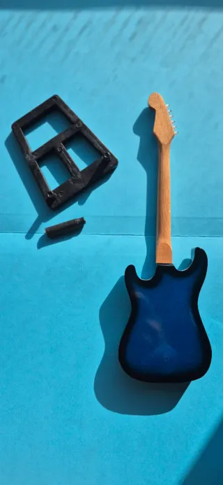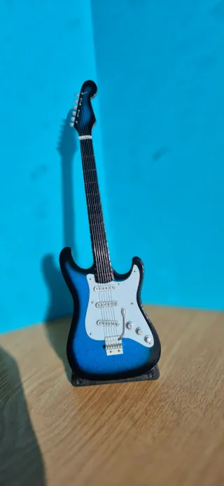 🎸 Mini guitarra eléctrica en madera, con acabado azul metalizado y detalles en blanco, inspirada en el icónico modelo Fender Stratocaster. Perfecta para decoración de estanterías, escritorios o vitrinas, o como regalo original para amantes de la música. Incluye base/soporte para exhibirla. Tamaño: 30 cm aprox. Estado: Excelente, como nueva No funcional, solo ornamental 💡 Ideal para coleccionistas, músicos o decoración temática. Añade un toque musical elegante y original a cualquier espacio.
