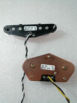 Pastillas de una Oqan QGE-TL10 NAT. Son dos single coil cerámicas para mástil y puente para guitarra tipo Fender Telecaster. Como nuevas. Conservan longitud suficiente en los cables, no se han cortado. Incluyen tornillos y muelles para montaje en pickguard.