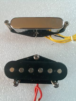 En buen estado, la de mástil es single coil cerámica de una J&D y la del puente una Humbucker de doble rail Fleor, creo que es de alnico. Para guitarra tipo Fender Telecaster. Conservan longitud suficiente en los cables, no se han cortado. Incluyen tornillos y muelles para montaje en pickguard o placa.