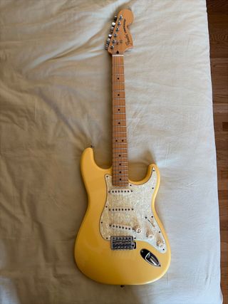 Cuerpo y mástil hechos por encargo, fabricados por las prestigiosas marcas americanas Warmoth, que fabricó el cuerpo y Musikraft, que fabricó el mástil. Maxima calidad. Cuerpo en madera de aliso, color "Vintage White", mástil y diapasón de arce. Todo en nitro. Cejilla de hueso.Como una 69 Stratocaster, pero con algunas especificaciones modernas como 22 trastes stainless steel y un cómodo radio 10".Todos los demás componentes son originales Fender, puente vintage hardtail, pastillas Fender Custom Shop 69, clavijero Fender vintage "F", potenciómetros, potes, knobs, switch, golpeador 3 ply white, jack. Estado excelente.