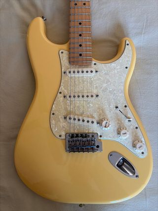 Guitarra Fender Stratocaster Roadhouse Deluxe del año 2012/13 en estupendas condiciones. - Single coils TEXAS SPECIAL (los modelos posteriores llevan noiseless) - sistema alimentado por pila donde puedes tocar de manera activa y/o pasiva. -Pote. para seleccionar modo activo o pasivo, con un filtro de paso para ajustar el grosor y brillo del tono. - Año 2012/13. - Color amarillo. - Mástil de arce. Una guitarra muy versátil respecto a los tipos de sonido que puedes sacar.