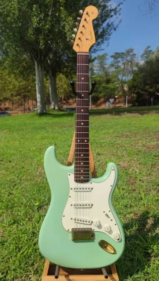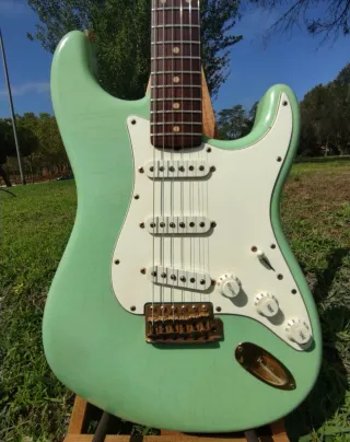 Guitarra eléctrica Fender Stratocaster Custom Shop, modelo 1960 Reissue, acabado en Relic - Closet Classic del año 2003. Presenta un acabado en color Surf Green 🏄🏻♂️☘️🟢 - Mástil de arce. - Diapasón de palisandro. - Pastillas single-coil bibinadas a mano - Herrajes dorado. - Acabada de ajustar por lutier profesional. Abstenerse cambios 🙏🏻🤗