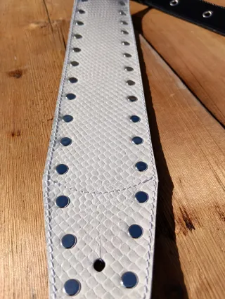 ANNEKEKAT Leather guitar strap belt bass Leather guitar strap adjustable by a buckle from 130 to 145 cmts. 100% hand made never used, made with high quality cow leather Gitarrengurt Sangle de guitare tracolla per chitarra correa de guitarra fender gibson marshall iron maiden judas priest guns n roses heavy metal hard rock Correa de guitarra de cuero con un diseño llamativo. La parte frontal es de cuero blanco con textura y está adornada con tachuelas plateadas. En el centro, presenta un distintivo círculo plateado con un pentagrama y un fondo rojo. - Material: Cuero - Color principal: Blanco - Detalle central: Pentagrama con fond
