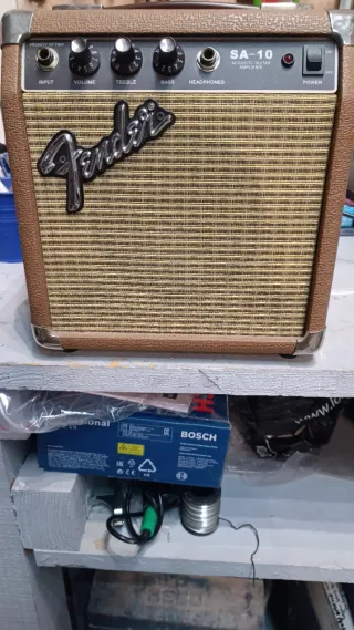 Amplificador de guitarra acústica Fender SA-10 en color marrón. - Controles de volumen, graves y agudos. - Entrada para auriculares. - Entrada de instrumento. - Botón de encendido/apagado.