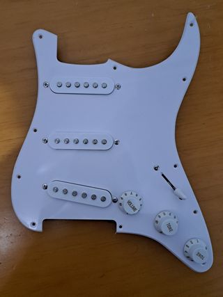 Protector de guitarra Fender Player Stratocaster con pastillas incluidas. Pieza de repuesto o mejora para tu instrumento. - Color blanco. - Incluye tres pastillas. Mástil y medios originales de la Fender player La del puente es una Fender custom ship fat 50 de puente la cubierta de esta es un poco más blanca que las otras dos .