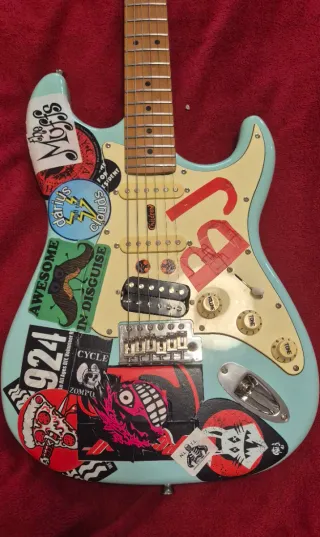 Guitarra Jet JS300 Inspirada en "Blue" La guitarra de Billie Joe de Green Day. Esta muy modificada con pegatinas de distintas epocas de green day, 2 pastillas simples y una pastilla Doble Gotoh en el puente. Potenciometro de volumen unico CTS sin cableado en los de tono y selector de 5 posiciones de fender para mas versatilidad. Clavijeros de bloqueo gotoh. Suena muy bien y es muy comoda. Precio negociable Green day, fender, squier, gibson, epiphone, yamaha, roland, boss, marshall, vox, ernie ball