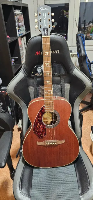 Guitarra acústica de la marca Fender. Su diseño clásico y acabado natural la hacen destacar. - Cuerpo de madera clara. - Diapasón oscuro con marcadores de posición. - Clavijero metálico plateado. -Incluye funda.