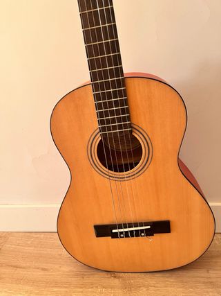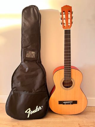 Guitarra clásica tamaño 3/4, ideal para iniciarse en la música. Incluye funda Fender. - Guitarra clásica tamaño 3/4. - Funda Fender negra. - Sin uso.