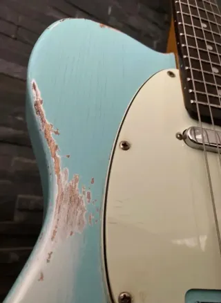 Telecaster con cuerpo ash y mástil rw importados de UK en nitro sonic blue en la zona del brazo y un sutil craquelado. Mástil muy cómodo, sus maderas, formas, nitro, trastes, bordes, son una pasada. Herrajes Fender, clavijero Wilkinson deluxe, electrónica deluxe americana y pastillas Fender Classic 50 de Alnico V, sonido Fendvintage cristalino.