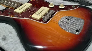Jazzmaster japonesa repintado cuerpo y pala en nitro muy top pastillas antiquity, cableado de algodón, potes CTS y condensadores PIO repintada en nitro, hardware de Jazzmaster americana y trémolo relic con el espaciado correcto proveniente de jaguar kurt cobain viene con case gator