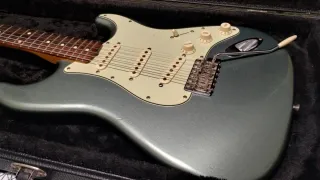 Guitarra eléctrica Fender American Standard del año 2012. Un clásico con un sonido inconfundible. Vendo porque no la uso y no está entre mis guitarras de directo, solo usada en estudio. Le puse unos clavijeros de bloqueo Schaller, también para la correa, pero tengo los originales así como el golpeador en blanco. Lleva unas pastillas custom shop fat 50, muy cálidas y limpias. Sólo un ding en la parte trasera como podéis ver en la foto, el resto está perfecta incluido trastes. Podéis ver todas las especificaciones en Internet. No hago envíos, gracias.