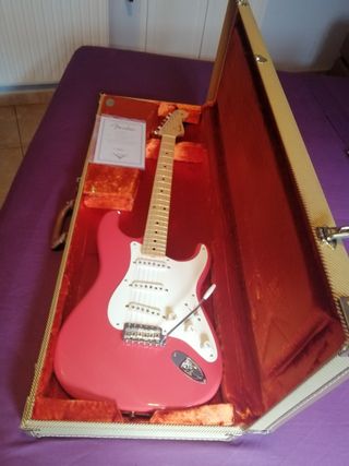 Fender 1956 Stratocaster NOS (2008 model), fiesta red adler body, maple fingerboard neck, custom shop ’50 single coil pickups, single ply white pickguard, Kluson style vintage tuners, complete with original case, COA and accessòries. Never used, never played. Completely NEW.