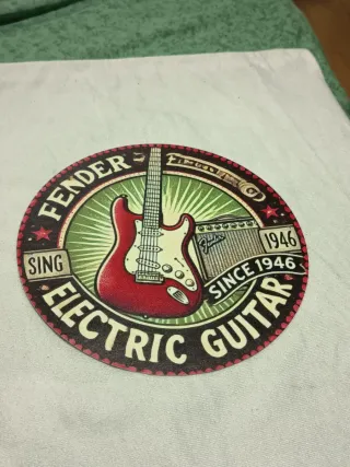 Placa decorativa con diseño de guitarra Fender. - Diseño de guitarra eléctrica. - Estilo vintage con acabado desgastado. - Imagen de guitarra en color verde.