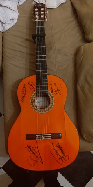 Guitarra flamenca firmada por leyendas del flamenco – Pieza única de colección Se vende guitarra flamenca única y exclusiva, tiene dos rajas laterales, firmada por cinco figuras imprescindibles del flamenco actual: Paco Cepero, Tomatito, José del Tomate, Israel Fernández y Diego del Morao. Una joya tanto para músicos como para coleccionistas. Ideal para quienes valoran el arte flamenco y desean conservar una pieza auténtica firmada por algunos de sus máximos exponentes. Características de la guitarra: Cuerpo: Flamenco Tapa: Abeto Alemán macizo Aros y fondo: Ébano verde Diapasón: Ébano Mango: Cedro Puente: Palosanto