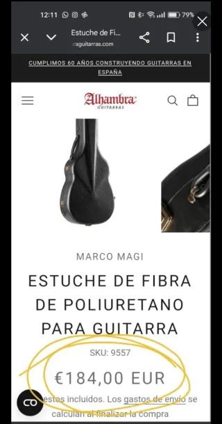 Estuche rígido de madera para guitarra clásica o flamenca de la marca Alhambra. Diseñado para proteger tu instrumento. - Fabricado en madera y piel - Exterior de cuero negro. - Cierres metálicos. - Asa de cuero. - Insignia de la marca. #vinculadas# Juan montes Antonio valeriano bernal Alhambra Ramírez Lorca paez Manuel guillena perez graciliano conde hermanos Atocha algodonales Sanchís Carpio bernal 7f 5c 11p 11c 10f prudencio saez g36 4f 3f flamenca clasica