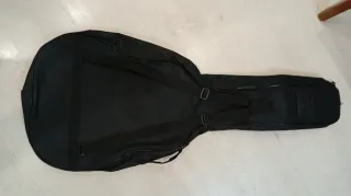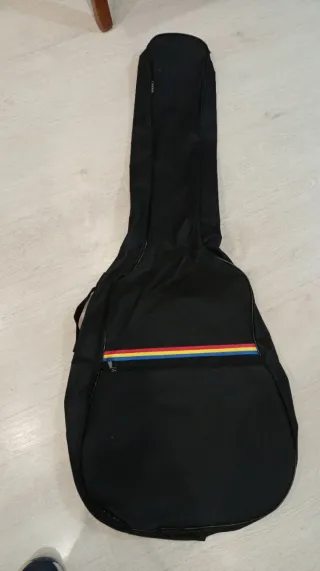 Funda negra para guitarra flamenca. Cuenta con un bolsillo frontal con cremallera y una banda decorativa de colores. Es casi nueva - Material resistente. - Cierre de cremallera. - Banda decorativa con rayas rojas, amarillas y azules.